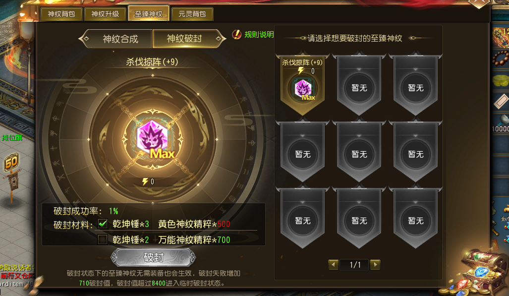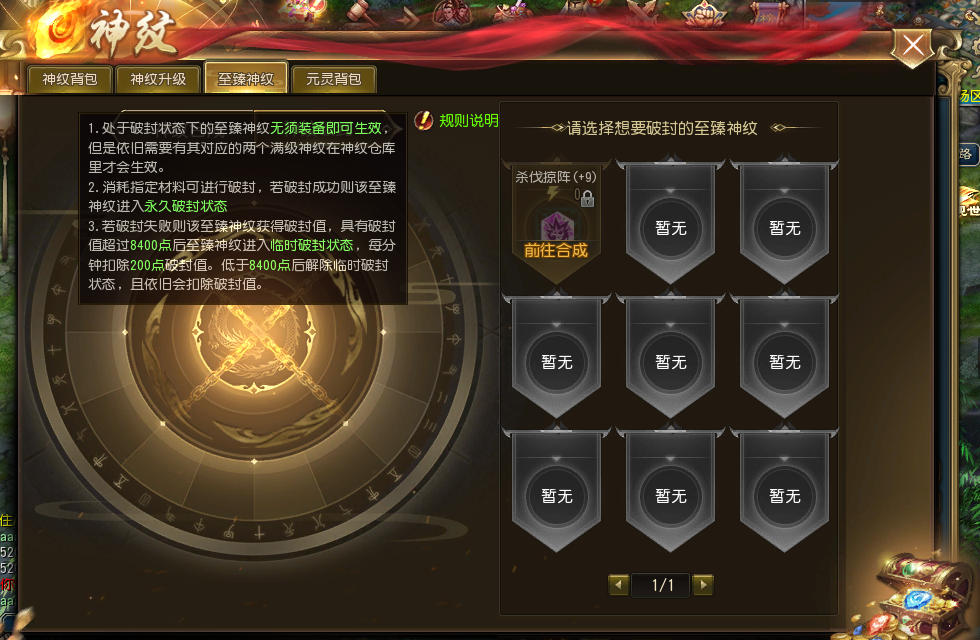 4、当前版本仅有至臻神纹:杀伐掠阵可以进行破封,我们将陆续为更多的至臻神纹开放破封,敬请期待!