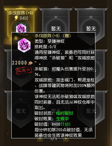 3、若破封失败,则该至臻神纹获得破封值,具有破封值超过8400点后,至臻神纹将进入临时破封状态——与永久破封相同的效果,但每分钟会扣除200点破封值。当破封值低于8400点后会自动解除临时破封状态,且依旧会扣除破封值。