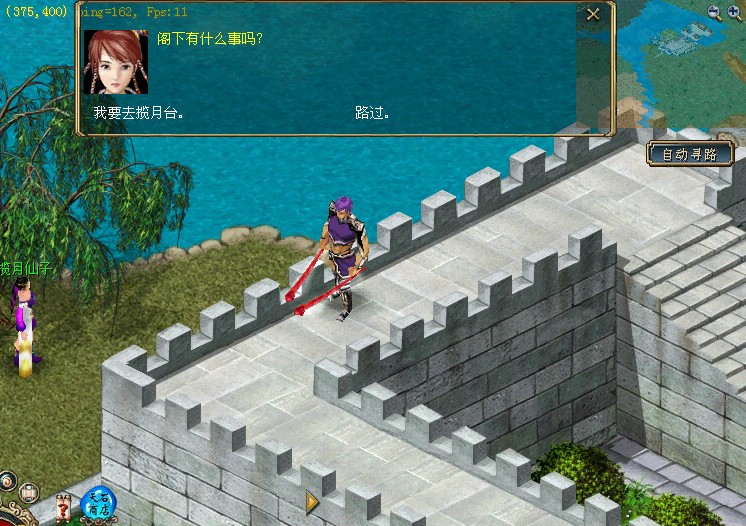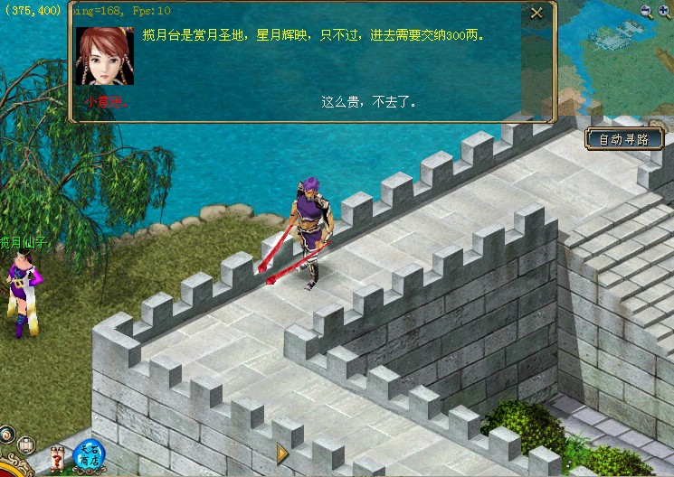 进入揽月台要到双龙城NPC揽月仙子( 372、407)和她对话,要收300两才能进入。