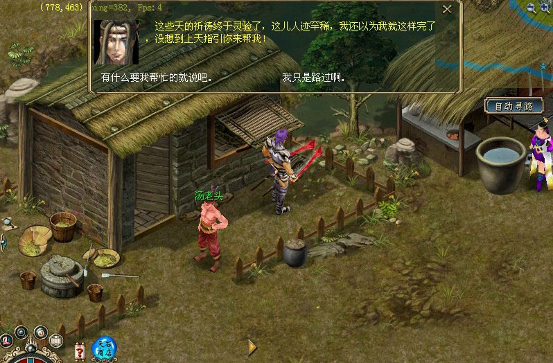 1. 途经枫溪林,发现汤老头(779,467),他因遇到林中毒火鼠的袭击,身中鼠毒,只好在茅舍暂避,他希望你能帮忙带来“毒鼠之牙” 作为药引,帮助他解毒疗伤。