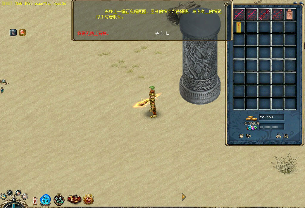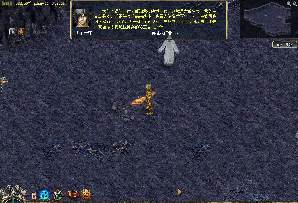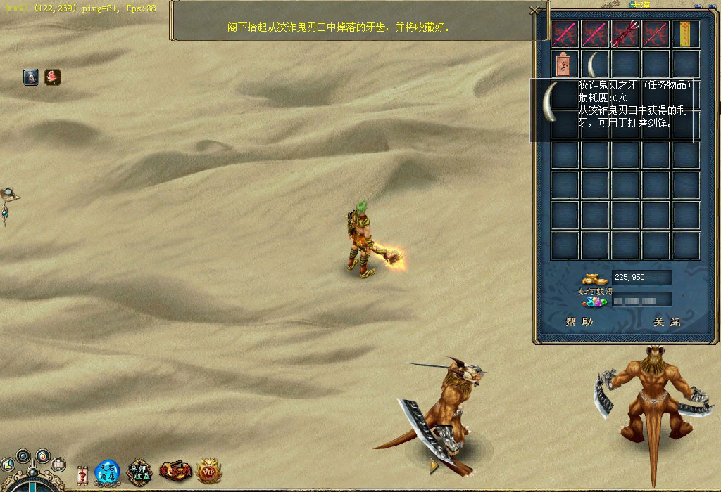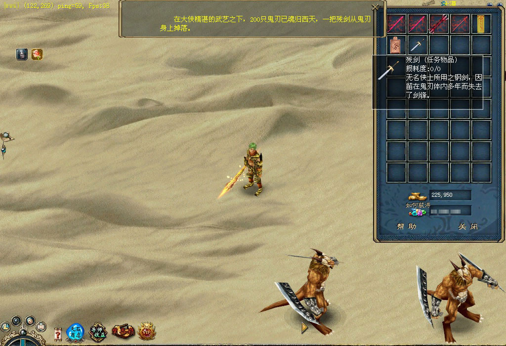 云门关的韩康心中深藏着一个关于无名侠士的秘密,传说只要进大漠找到无名侠士便可得到他手中之剑——绝世神兵,因此他决定帮助武林人士找到绝世神兵。你若是想得到那把绝世神兵,不妨前去看看。 他就是韩康,听完他关于无名侠士的故事后,你是否被震撼了?那就快行动吧,先按韩康的描述,到大漠杀狡诈鬼刃吧。 杀死狡诈鬼刃后会得到一卷符咒,快看看上面写了些什么,说不定与无名侠士有关。 根据这个符咒的指引可找到一个石柱,这石柱很神秘, 突然符咒与石柱产生共鸣,快查看石柱。 啊,竟然来到了一个洞穴,太好了,无名侠士就在这里,他旁边有四个石柱也很神秘,不妨去看看,好像是记载着无名侠士的剑法心得。 你对无名侠士说明了来意之后,无名侠士要求你到大漠杀死200只鬼刃,并帮他把兵器找回来。 杀完200只鬼刃后,无名侠士又要求你帮他收集5个狡诈鬼刃的牙来磨刀,看来这牙一定不是普通的牙。 你把牙带回来了,无名侠士将他的心思都告诉你,根据他的描述,你得去云门关找找韩康。 找到韩康后才知道其中有无数的恩恩怨怨,快带着韩康的手信回去找无名侠士吧。 得到手信的无名侠士感慨万千,最后他给你一个荷包,并请求你带给白鹭城的桃花。 你满肚疑惑地找到桃花,并把荷包交给她。桃花解开荷包后发现一字条,看完字条后她痛不欲生,并把事情的始末都告诉了你。最后她将一个究极历练牌交给了你,同时你还会得到大量经验和金钱噢! 得到究极历练牌后快到训练师那换取奖励吧,这是真可谓是人间的一场爱恨情仇啊。 |