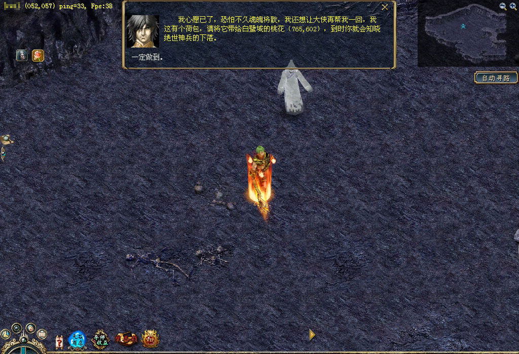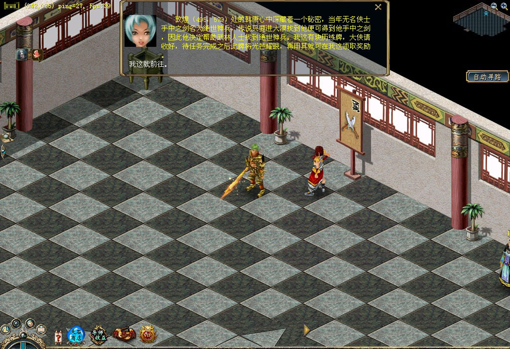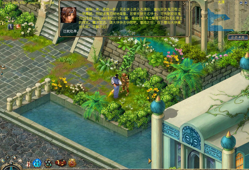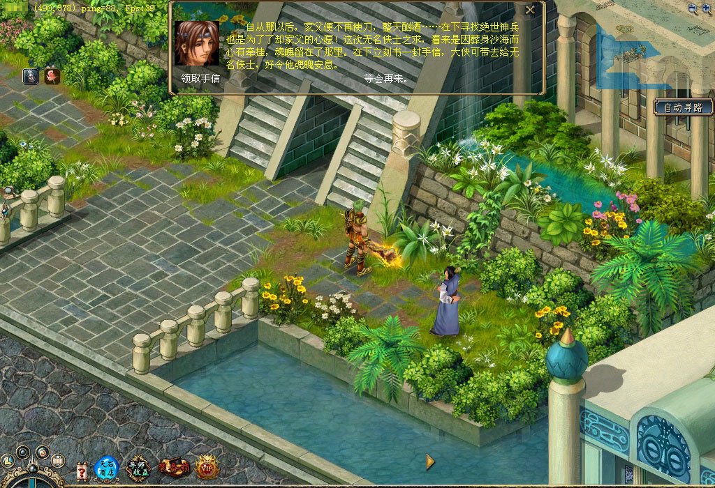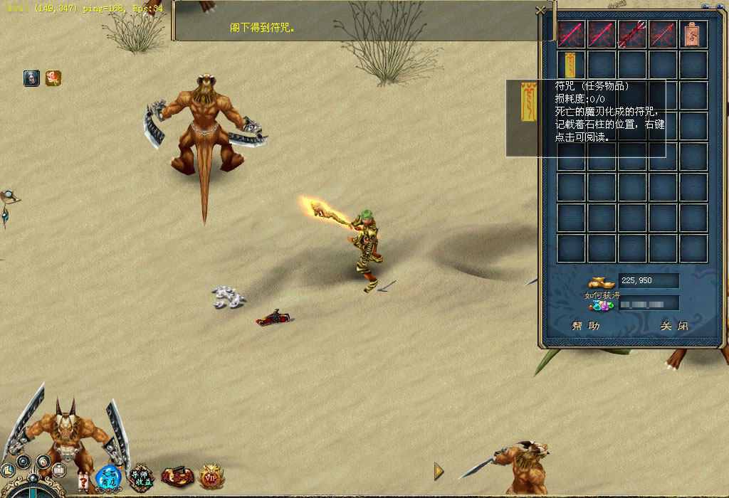 云门关的韩康心中深藏着一个关于无名侠士的秘密,传说只要进大漠找到无名侠士便可得到他手中之剑——绝世神兵,因此他决定帮助武林人士找到绝世神兵。你若是想得到那把绝世神兵,不妨前去看看。 他就是韩康,听完他关于无名侠士的故事后,你是否被震撼了?那就快行动吧,先按韩康的描述,到大漠杀狡诈鬼刃吧。 杀死狡诈鬼刃后会得到一卷符咒,快看看上面写了些什么,说不定与无名侠士有关。 根据这个符咒的指引可找到一个石柱,这石柱很神秘, 突然符咒与石柱产生共鸣,快查看石柱。 啊,竟然来到了一个洞穴,太好了,无名侠士就在这里,他旁边有四个石柱也很神秘,不妨去看看,好像是记载着无名侠士的剑法心得。 你对无名侠士说明了来意之后,无名侠士要求你到大漠杀死200只鬼刃,并帮他把兵器找回来。 杀完200只鬼刃后,无名侠士又要求你帮他收集5个狡诈鬼刃的牙来磨刀,看来这牙一定不是普通的牙。 你把牙带回来了,无名侠士将他的心思都告诉你,根据他的描述,你得去云门关找找韩康。 找到韩康后才知道其中有无数的恩恩怨怨,快带着韩康的手信回去找无名侠士吧。 得到手信的无名侠士感慨万千,最后他给你一个荷包,并请求你带给白鹭城的桃花。 你满肚疑惑地找到桃花,并把荷包交给她。桃花解开荷包后发现一字条,看完字条后她痛不欲生,并把事情的始末都告诉了你。最后她将一个究极历练牌交给了你,同时你还会得到大量经验和金钱噢! 得到究极历练牌后快到训练师那换取奖励吧,这是真可谓是人间的一场爱恨情仇啊。 |