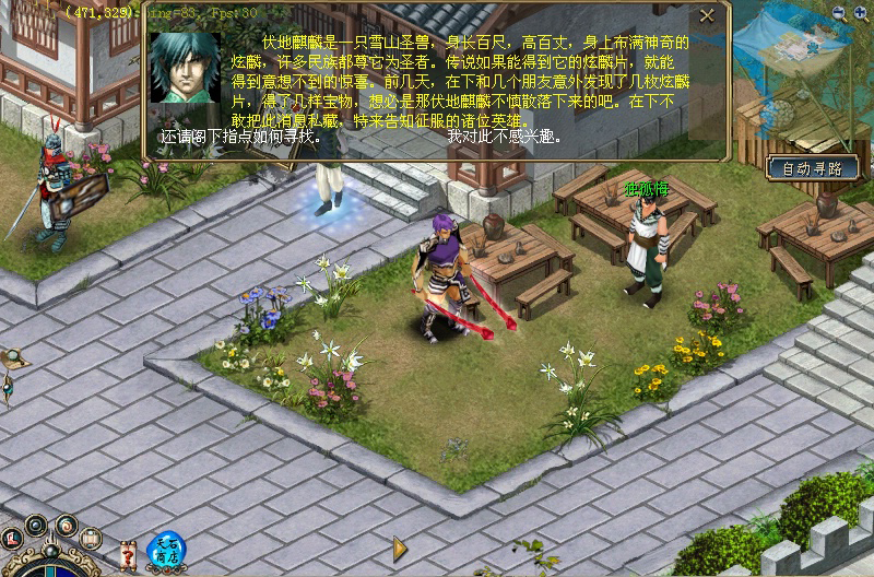 1、 如果在双龙城遇到一个叫独孤悔(473,325)的人,他向你透露:如果谁能够得到雪山圣兽——伏地麒麟身上的炫麟片,就会有意想不到的惊喜!就在前几天,他与几位朋友就在郊外意外地发现了几片炫麟片,并得到了几件宝物!他估计这些炫麟片是伏地麒麟经过这个地方时,不慎掉落的………… 2、 细问之下得知:在每天夜间八点以后,地上的某些地方会出现一些闪亮异常的光点,这个应该就是炫麟片了。你若有幸看见了炫麟片,将它拣起来,就有可能得到从伏地麒麟身上掉落的宝物啦!可能是 1000银两,也可能是5000银两,还可能是10000银两,幸运的话能得到流星甚至是龙珠呢。 |