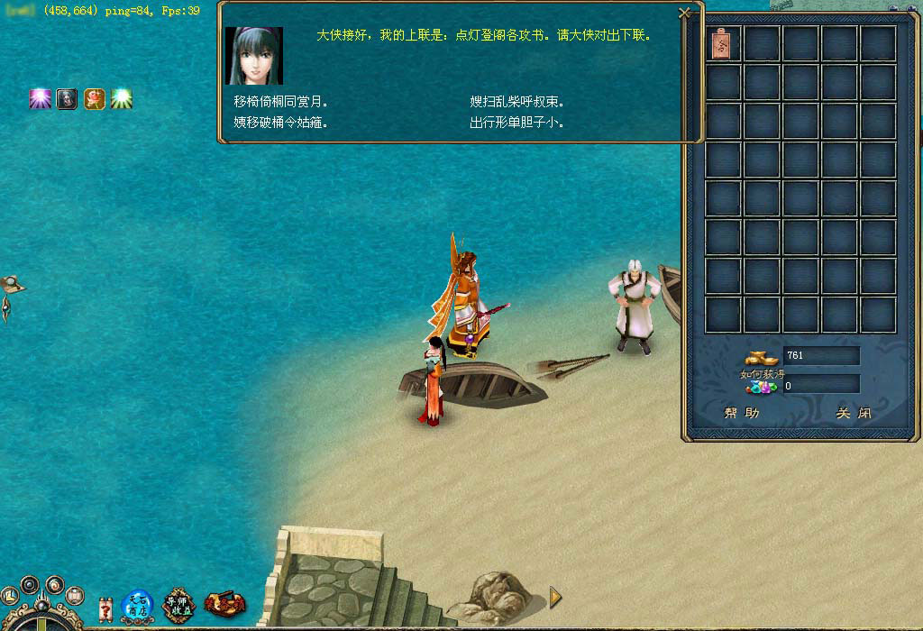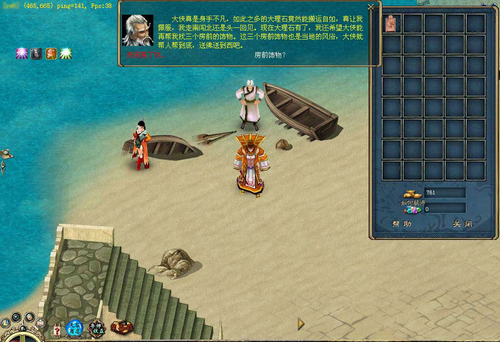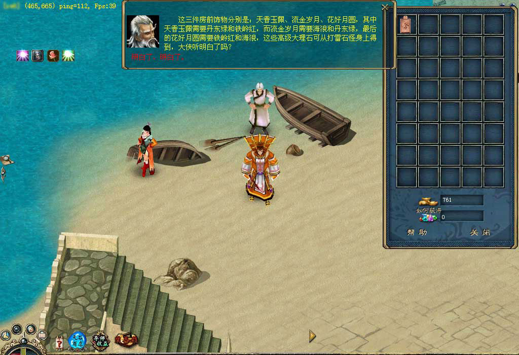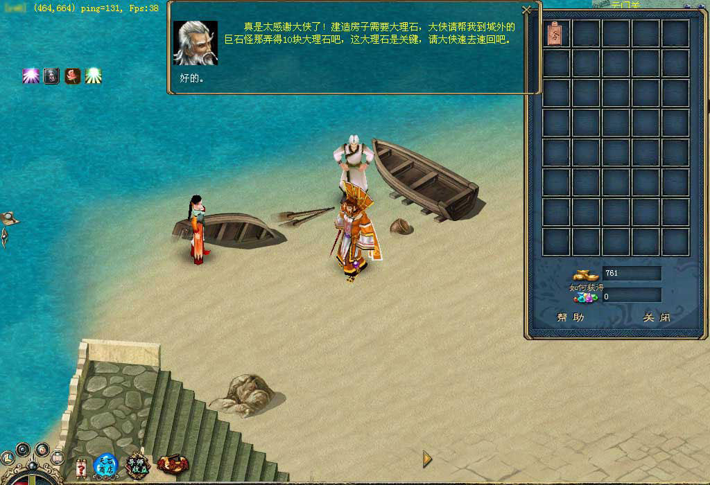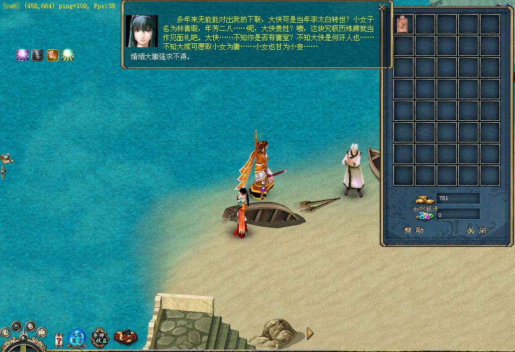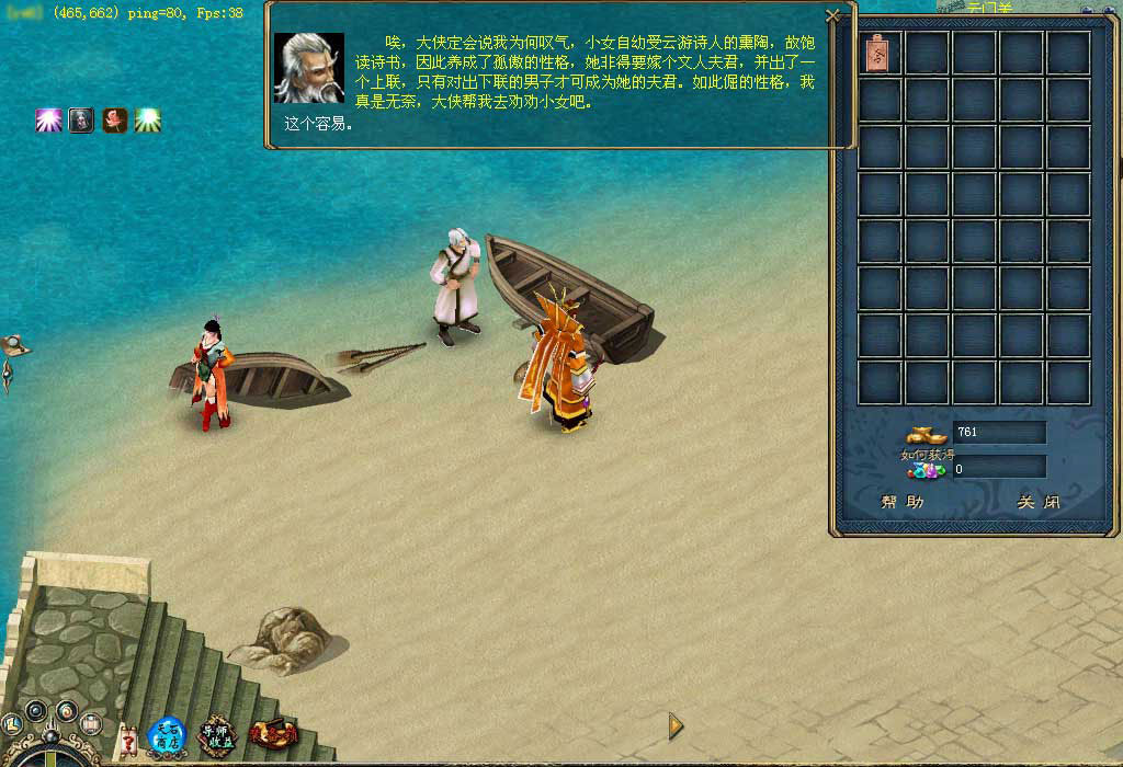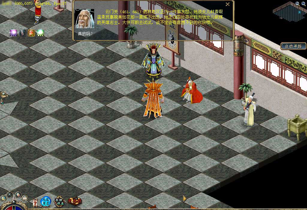 云门关的林老汉正为一件事发愁,他说女儿林青瑕温柔贤惠貌美如花,却一直嫁不出去,其中定有缘由,大侠可前去牵线做媒,说不定还可抱得美人归噢。 他就是林老汉,看到一脸愁眉苦脸的样子,就知道他遇到了难事,快问问吧。 他竟然有个温柔贤惠貌美如花的女儿,由于林老汉没有房子,所以女儿一直未嫁。所以你这次得帮他弄到10块大理石,用来建造房子。 据说城外的石头怪那有很多的大理石,看来你找对地方了。收集10块大理石后,就快回去找林老汉吧。 得到大理石的林老汉激动不已了,不过他还需要三件房前饰物,分别是天香玉佩、流金岁月、花好月圆,这也是当地的风俗。 制作这些饰物的材料分别是海浪、丹东绿和铁岭红,这些材料可从雷石怪身上获得。 得到这些材料后,点击使用丹东绿时,如果有铁岭红则组合出饰物天香玉佩。点击使用铁岭红时,如果有海浪则组合出饰物花好月圆。点击使用海浪时,如果有丹东则组合出饰物流金岁月。 这三件饰物总算都做好了,快交给林老汉吧,这下她的女儿应该可以嫁出去了吧……啊?她女儿出难题了,快去帮林老汉劝劝她。 原来林青瑕是个才女,非得你先对出她的上联,她才会听你说话,不过这个对联很简单,你很快就对出了。 对你佩服不已的林青瑕会给你一块究极历练牌噢。若你是位婀娜多姿的女侠,林青瑕会与你结义金兰;若你是为汉子,她…… 得到究极历练牌到训练师那里换奖励吧,说不定林青瑕出嫁时还会宴请大侠噢。 |
