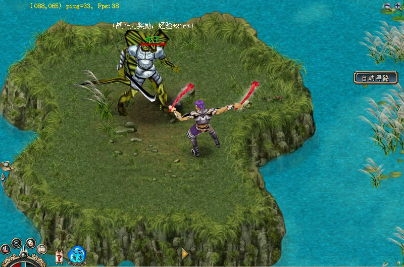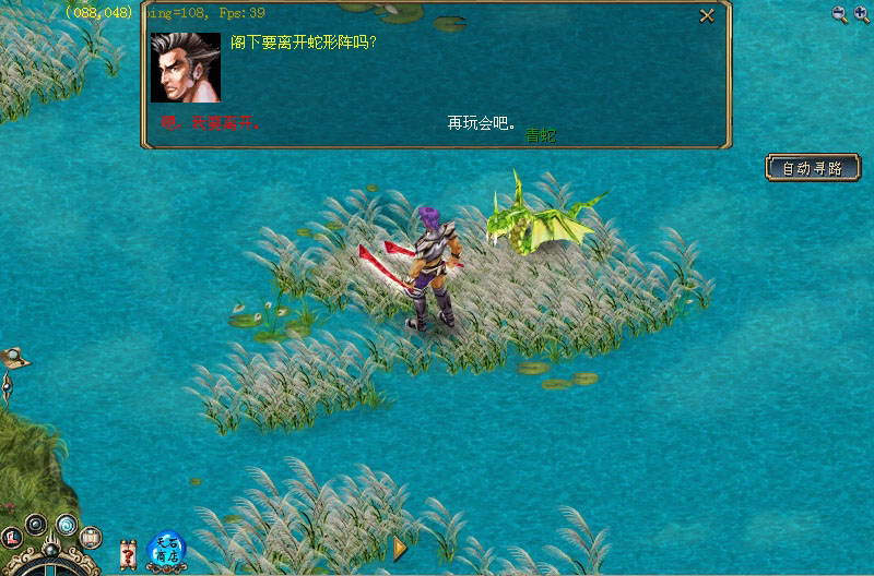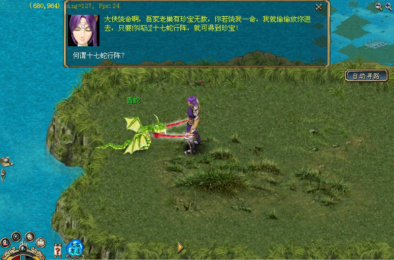 1.白鹭城外的芦花荡见到一条青蛇精(678,966),从它口中得知它的巢穴中有珍宝无数,只是有个凶险异常的“十七蛇阵”在守卫着这些珍宝,若你肯饶它一命,它答应将你偷偷引入“十七蛇阵”中。 2.进入阵行之后,经过一番激战,才在群蛇之中,找到了它们的头头——蛇王!打死它后,可能得到一双良品鹰爪靴,或者5 颗流星,或者一颗龙珠,还有可能是各种良品宝石或优质宝石哦~ 3.杀死蛇王后,与青蛇「87,44」对话即可离开湖岛。 |