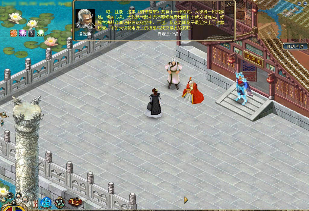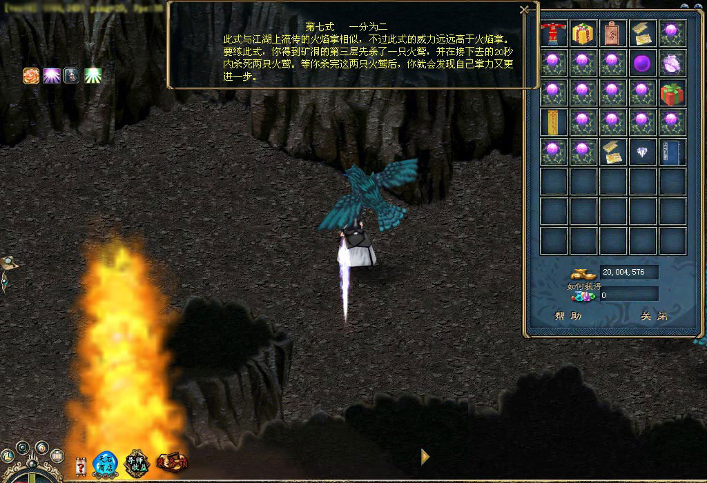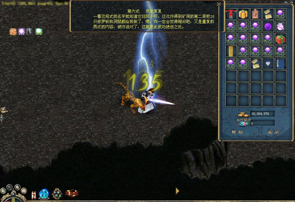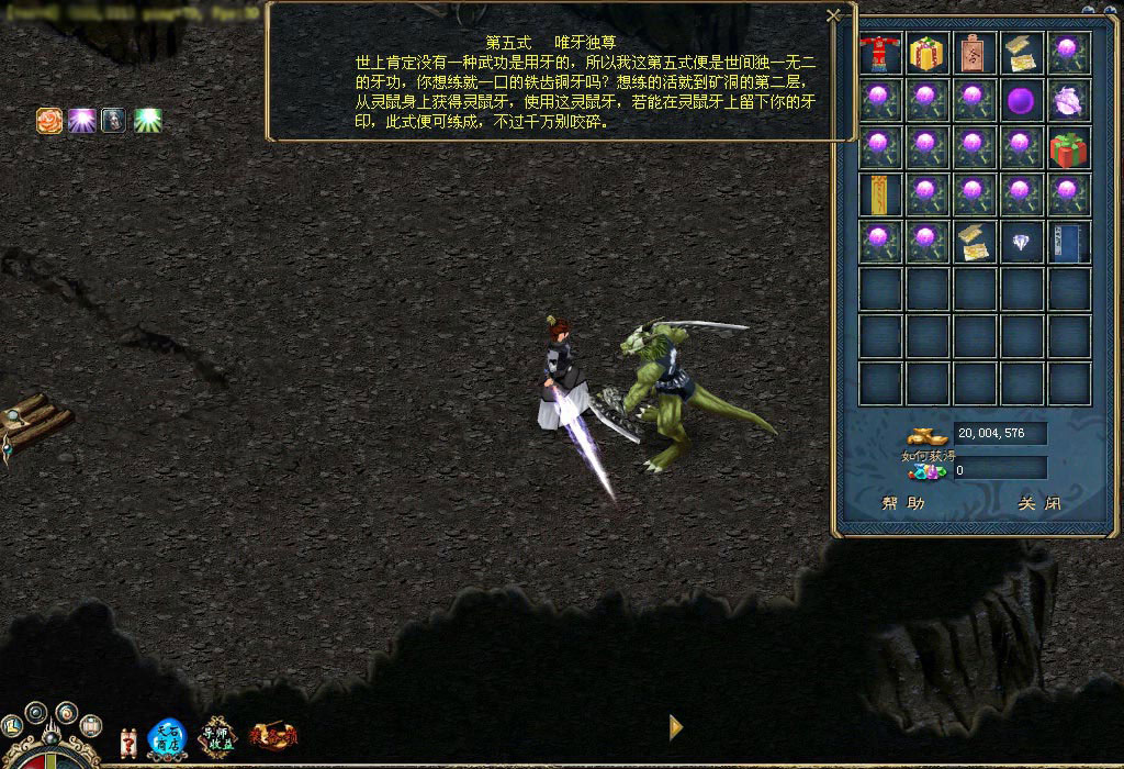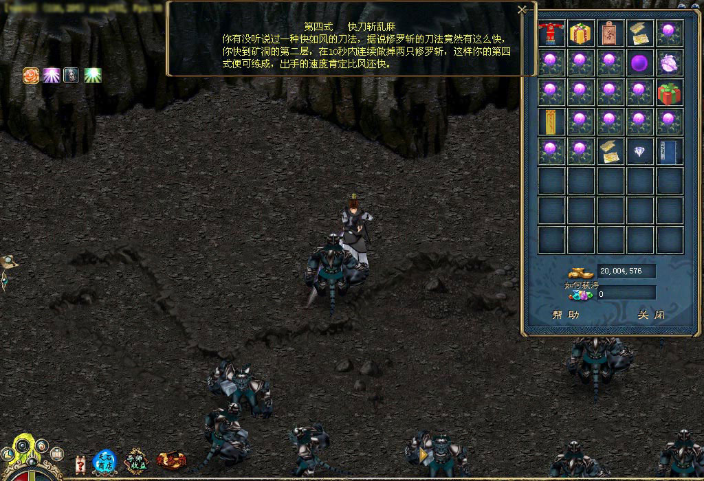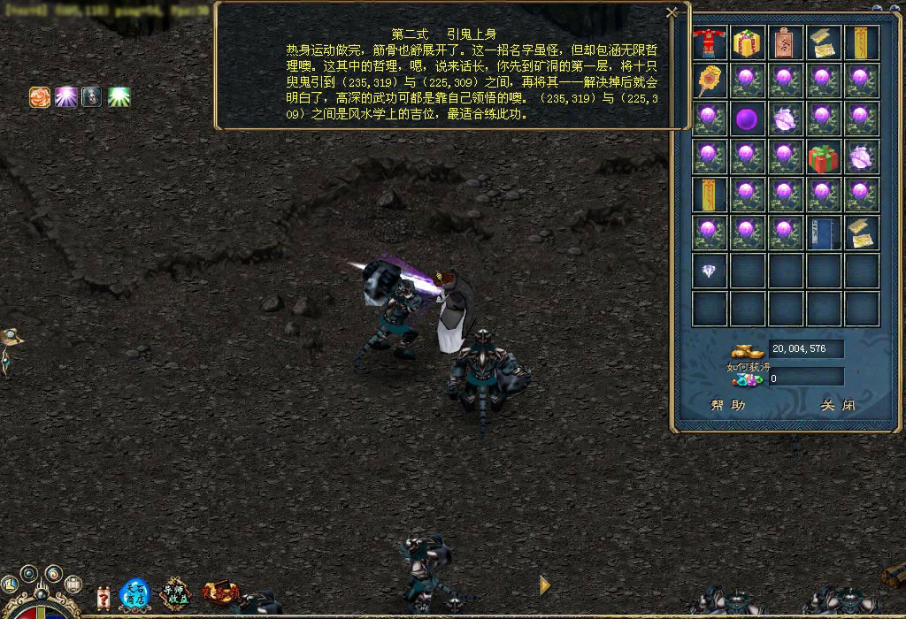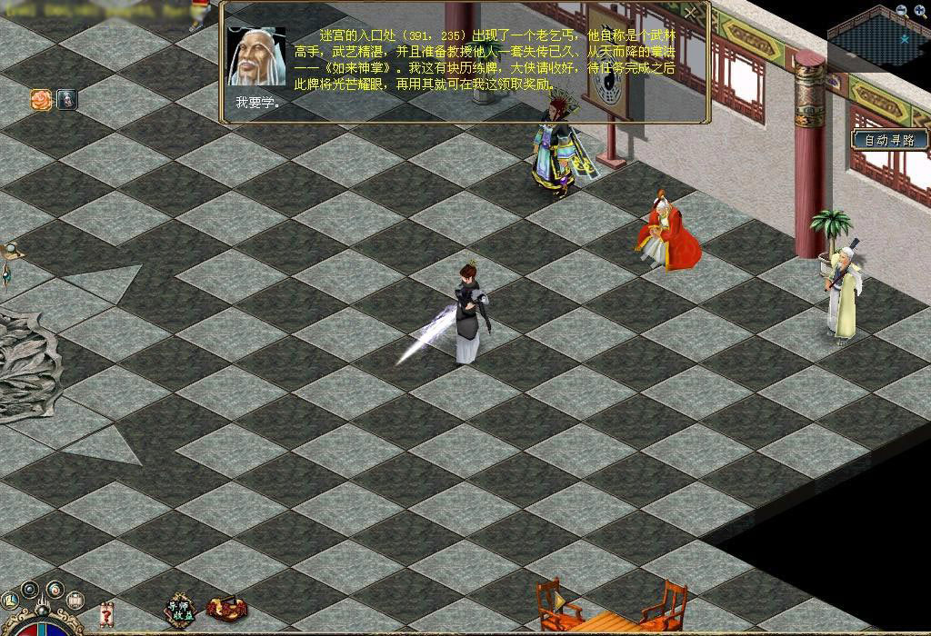 迷宫的入口出现了一个老乞丐,他自称是个武林高手,武艺精湛,并且准备教授他人一套失传已久、从天而降的掌法——《如来神掌》。若你也想学这套掌法,不妨去试试 这个老乞丐自称是个武林高手,手中有一套秘笈叫《如来神掌》,如果你想学的话,得用一颗流星和他换,不过一颗流星换一本绝世秘笈,应该值得吧。 得到秘笈后,你是否兴奋不已了,快打开看看吧。据说这秘笈有十一式,先从第一式开始吧。第一式很简单,只是个热身运动,按上面的说明到迷宫第一层杀死20只晶奴吧。 第一式这么快就练成,真有点吃惊,继续往后看。第二式叫引鬼上身,怪怪的名字,不管他,练就是。这一式需要进入迷宫第一层,将臾鬼引到(217,304)或(244,136)或(314,213)之间杀死,需要杀死10只。 你很快就练成了第二式,再看看第三式吧。第三式是添油加醋,竟然是重复前两式,各杀死15只晶奴和臾鬼,这次就不需要将臾鬼引到特定地点了。噢,可能是熟能生巧吧。 第三式也就这么搞定了,翻到第四式:快刀斩乱麻。这次需要进入迷宫第二层,在10秒内连续杀死两只修罗斩,说容易也不容易。 再来看看第五式,唯牙独尊,天底下竟然有用牙的武功,这套《如来神掌》果然与众不同,这次需要进入迷宫第二层杀掉灵鼠,并得到1个灵鼠牙。咬咬看吧,在这坚硬如铁的灵鼠之牙上留下自己的牙印,才算成功。 第六式名为反反复复,其实就是重复前两式,进入迷宫第二层,各杀死10只灵鼠和修罗斩。 转眼间就练成六式,太不可思议了。再看看第七式一分为二,这次需要进入迷宫第三层,在20秒内连续杀死两只火鹫,这就是所谓的一分为二?这秘笈果然是博大精深! 好不容易到了第八式:嘴吃四方,难道与吃有关,快看看。原来是进入迷宫第三层,从蝠獍身上获得翅膀,并将翅膀带到火堆(598,738)里烧烤,这烤完后难道可以吃了? 这套掌法真是一式比一式奇怪,这第九式叫精益求精,算正常一点了。这次需要进入迷宫第三层,各杀5只火鹫和蝠獍,这不是换汤不换药吗? 噢,第十式是红烧牛肉,哇难道有牛肉吃。啊,原来是带着从火鹫身上获得的羽毛,进入迷宫第四层烤牛肉哇。从迷宫第三层火鹫身上得到火鹫羽,然后去第四层打牛精,并在牛精尸体旁迅速使用羽毛,可点燃尸体,共需要点燃10具牛精尸体。这牛肉有谁敢吃么? 最后一式是……怎么是空的,难道被骗了,快去找老乞丐。经过老老乞丐一说,顿时豁然开朗,原来真是被骗了。不过还是从老乞丐那得到一块究极历练牌,并且得到了大量经验和金钱。 凭此究极历练牌到训练师那换取奖励吧,虽然没练成神功,不过这经历也蛮有趣的。 |