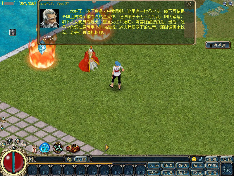 1、在帮派战最后2小时,找到天星子,领取一星圣火令,点燃一星圣火柱。
