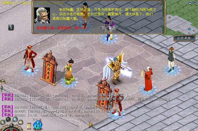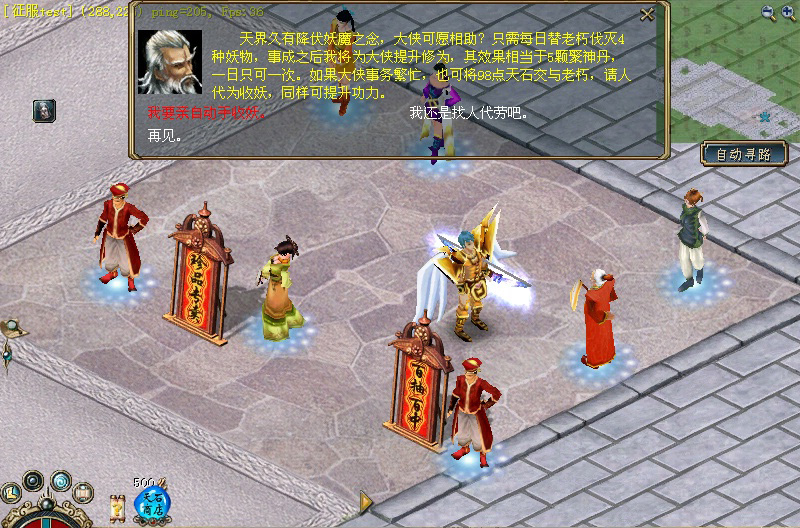 1、人间妖魔肆虐,天界久有降伏之心,摩云真人本是介于天人二界的散仙,此次也身负天界之命而来。刚刚升级到120级的玩家会收到来自摩云真人的一封信,提示玩家可以到市场(291,224)摩云真人那里接天魔降伏任务了。这封信可不要丢掉了,因为可以直接换到相当于1颗聚神丹的经验哦。