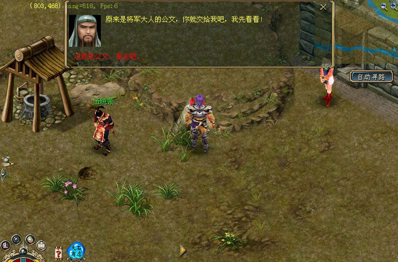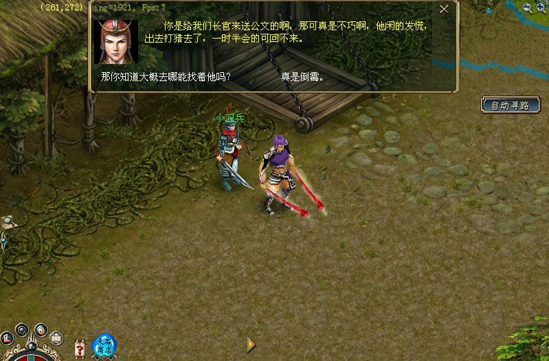 为解将军燃眉之急,你决定帮助他送出这封急件。将军颇为感激,交给你一封致伍统领的急件,并告知你:伍统领(800,471)就在鸣凤堡,而当你抵达鸣凤堡,找了半天也没能找到伍统领的踪迹,到底是怎么回事儿呢? 经过四处打听,终于在小卫兵(259,272)处打听到消息:原来,伍统领酷爱打猎,你去得不巧,他正好到鸣凤堡东南方的小村附近一处树林打猎去了,去那里可以找到他。统领脾气古怪,轻易不搭理陌生人,为此,小卫兵还特地给了你一封介绍信,也要保存好哦。 |
