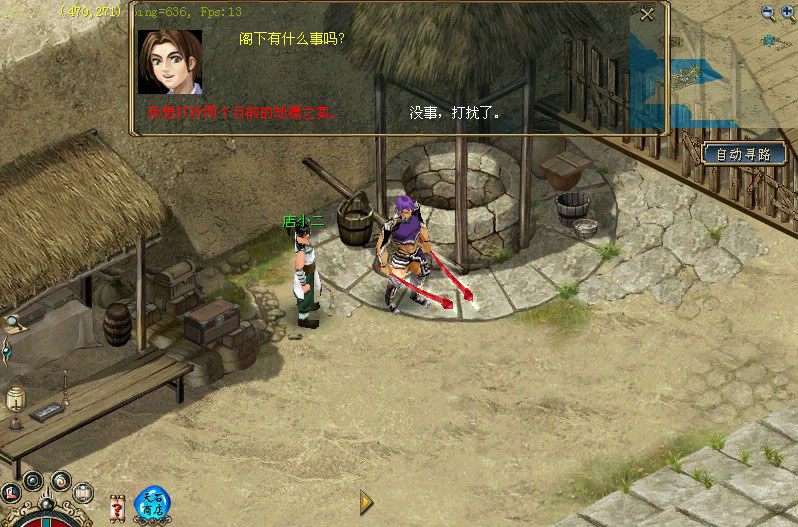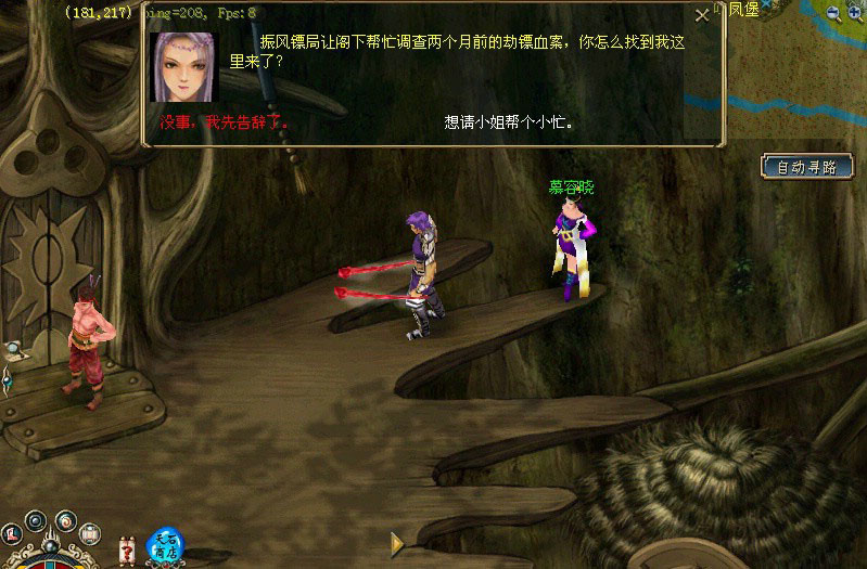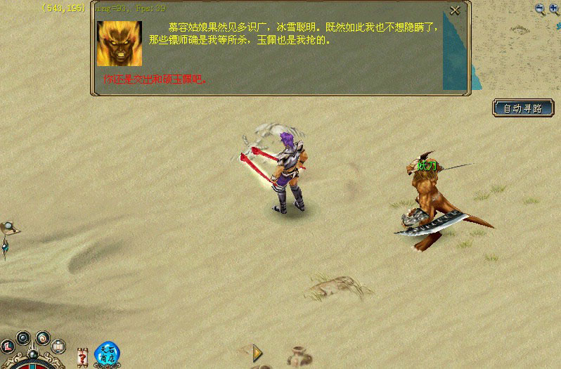 带着慕容晓的信到云门关,去新沙漠(163,471)找妖刀(547,193),妖刀见信,承认是他截的镖。几经交涉,发觉妖刀生性鲁莽好强,以武力威胁他,要回玉佩的机会是微乎其微,且节外生枝,实非上策。考虑再三,你答应帮他找回玉麒麟,他才同意在拿到玉麒麟后,把玉佩交还给振风镖局。