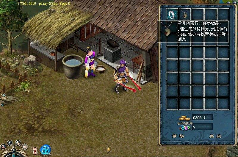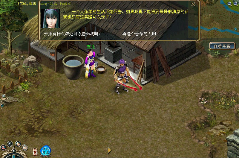 1、 在枫溪林的小村里,遇到一位叫小雪(783,456)的姑娘,她想请你到黑虎城帮忙打探她哥哥——鹏飞的消息,答应后可得到一块“雪儿的玉佩”作为信物。 | ||