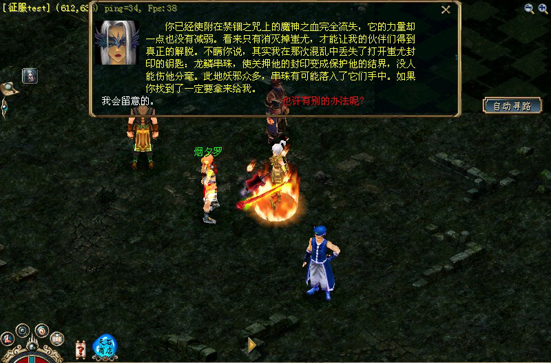 烟夕罗要求你按顺序杀定时刷新的8只鬼怪, 嘲风、蒲牢、离吻、震宇、闻天、帝乙、盘庚、诸亥,杀21600滴魔神血(循环杀1轮能除掉2400滴魔神的血)。你可以随时回到烟夕罗那里查询自己杀了多少滴魔神之血。你走到那8只鬼怪所在的区域,会看到指示的路标(禁锢之咒),路标可以告诉你此处会遇到哪只鬼怪。切记一定要按顺序杀这8只鬼怪,否则即使杀了也是徒劳无功。 8只怪的坐标是: 嘲风——93,552附近 蒲牢——305,686附近 离吻——474,599附近 震宇——658,490附近 闻天——701,326附近 帝乙——650,987附近 盘庚——556,96附近 诸亥——996,693附近 魔神之血流失殆尽,禁锢之咒却还没有完全被破除。原来,还得杀死躲藏在封印中的蚩尤。能打开封印的钥匙:龙鳞串珠,已经落入妖魔的小头目千年蛇精、冥车首领、邪鬼王和角鬼等怪物手中。你去找到串珠,然后消灭具有三种战斗形态的亘古恶魔蚩尤,禁锢之咒才会完全被解除。