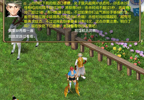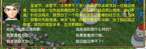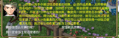 超迈大使见你天庭饱满,神采飞扬,对你十分满意,他爽快地发给你一块超迈清爽糖。并告诉你说,只要吃下超迈清爽糖,就能获得1分钟超迈状态,在这段时间里你会全身冰爽,像旋风一样快速地击杀怪物!杀怪时间间隔越短,得分越高,还有可能获得再次超迈的机会呢!总之,只要超迈状态结束时,杀怪分数累计达到80分,就可以回来向他领取奖励啦。