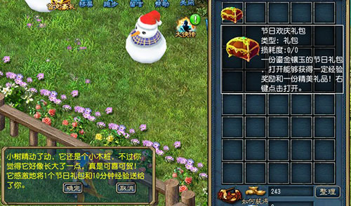 面对小树精苗苗的恳求,身为一位热血大侠的你,怎么能够袖手旁观呢?你来到双龙城花圃区寻找小树精苗苗,它告诉你,在双蛋节期间,双龙城周围出现了几个圣诞小精灵,只要每天从它们手里拿到5个魔力圣诞小礼物带回来给它,就能够帮助苗苗修行。当然,苗苗已经跟圣诞小精灵们说好了,你只要将礼物带回给它就行!居然这么简单!你当然轻松地答应了苗苗。