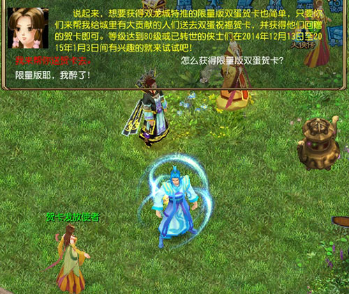 号外号外!双蛋节期间,双龙城特推出限量版双蛋贺卡,想要收藏的侠士要赶快行动啦!想知道获得途径?条件达到的侠士们在活动期间都来找美美的贺卡发放使者询问吧!